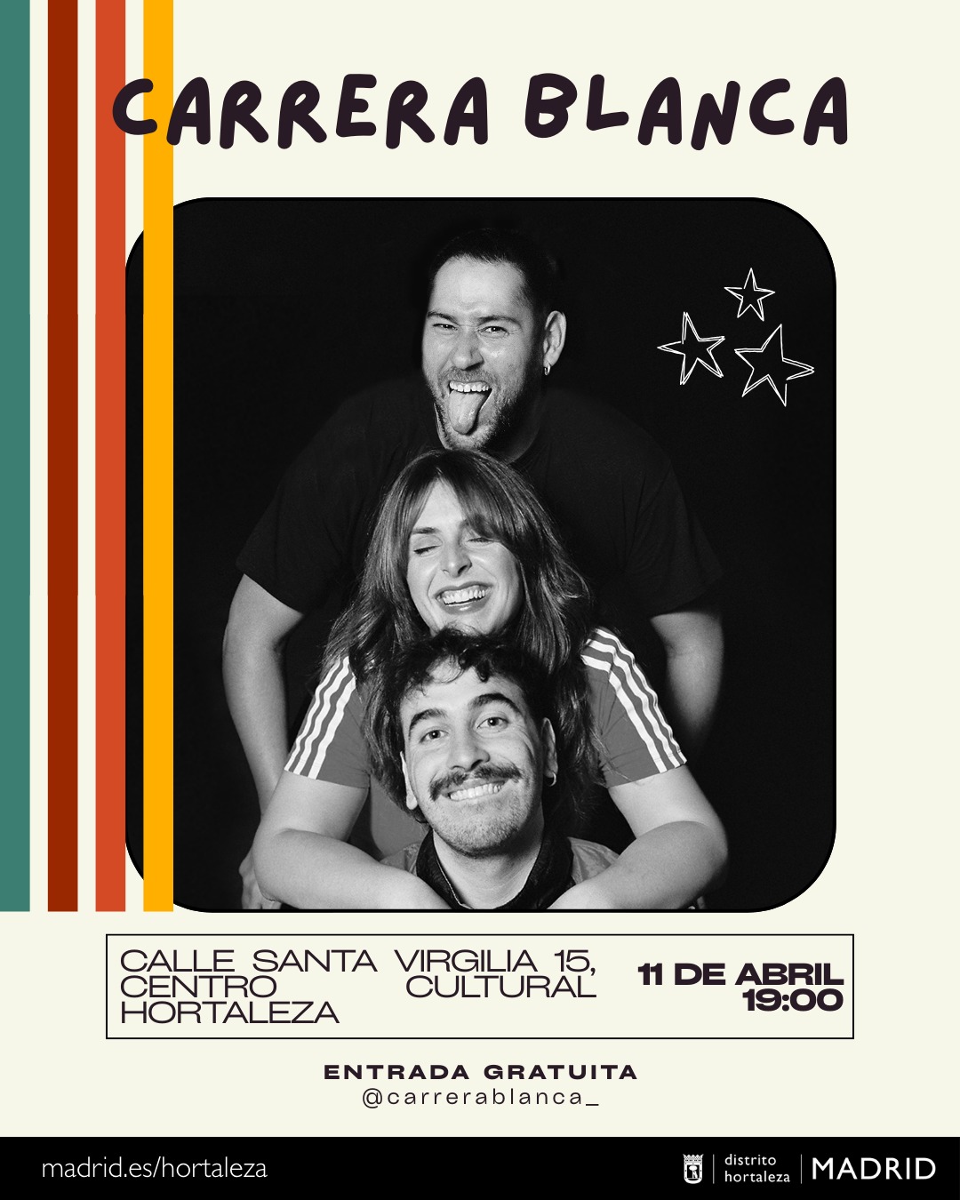 El viernes 11 de abril a las 19.00 horas, se celebra un concierto de Carrera Blanca que realizan en el centro cultural Hortaleza (calle Santa Virgilia, 15).