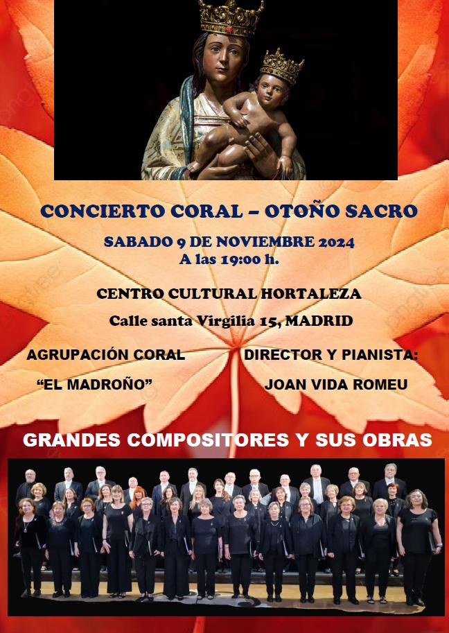 El sábado 9 de noviembre a las 19.00 horas, el vecindario está invitado al concierto coral-otoño sacro de la agrupación coral El Madroñoel coro más grande de Hortaleza fundado en 1986, en el centro cultural Hortaleza (calle Santa Virgilia, 15), bajo la dirección del pianista Joan Vida Romeu.