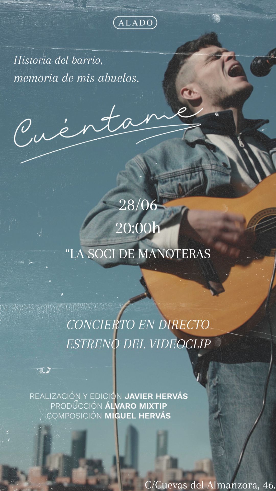 El sábado 28 de junio a las 20.00 horas, el cantautor manoterano Miguel Hervás –bajo el nombre artístico de Alado–, presenta su nuevo proyecto musical, con la proyección del videoclip del single «Cuéntame», seguida de un coloquio posterior y de un concierto en la Soci de Manoteras (calle Cuevas de Almanzora, 46).