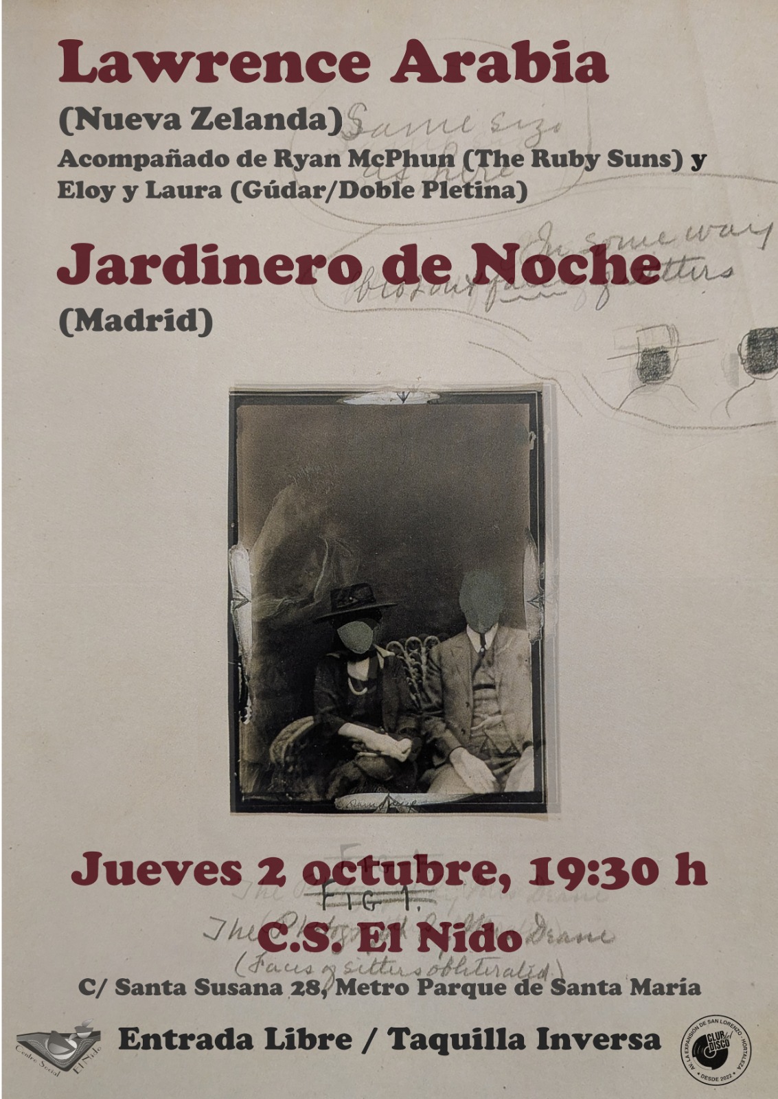 A Lawrence y su banda los acompañarán Jardinero de Noche, un nuevo grupo madrileño compuesto por Jon, Rafa y Meri. Sin guitarra en el grupo, solamente con bajo, batería y teclado, construyen una música bailable y divertida, con influencias que van desde Gang of Four a LCD Soundsystem. Acaban de editar su primer EP, Gente ocupada.