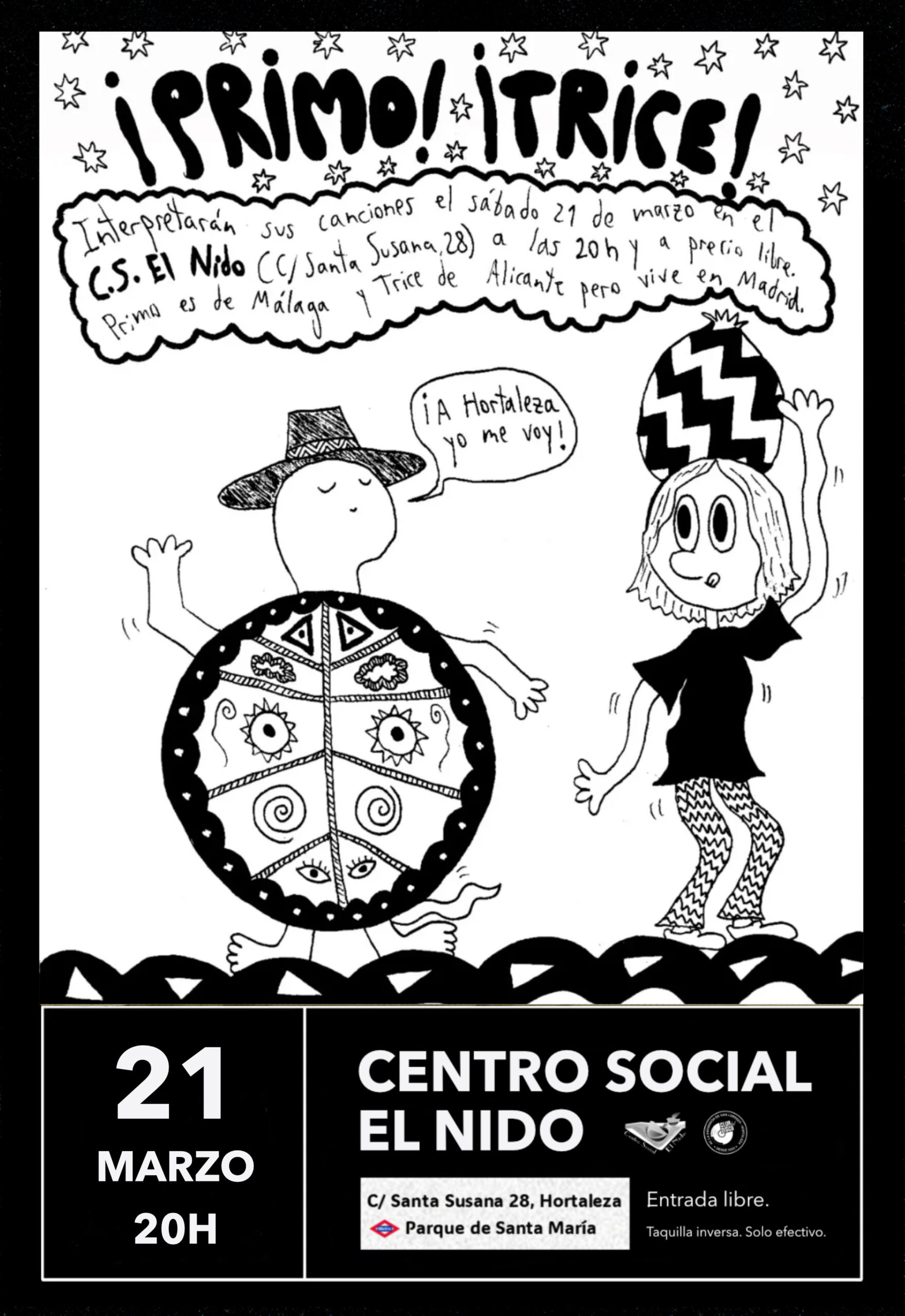 El sábado 21 de marzo a las 20.00 horas, comienza una nueva temporada de conciertos del Club del Disco de Hortaleza en el centro social El Nido (calle Santa Susana, 28 bajo) con las actuaciones de Primo y Trice.