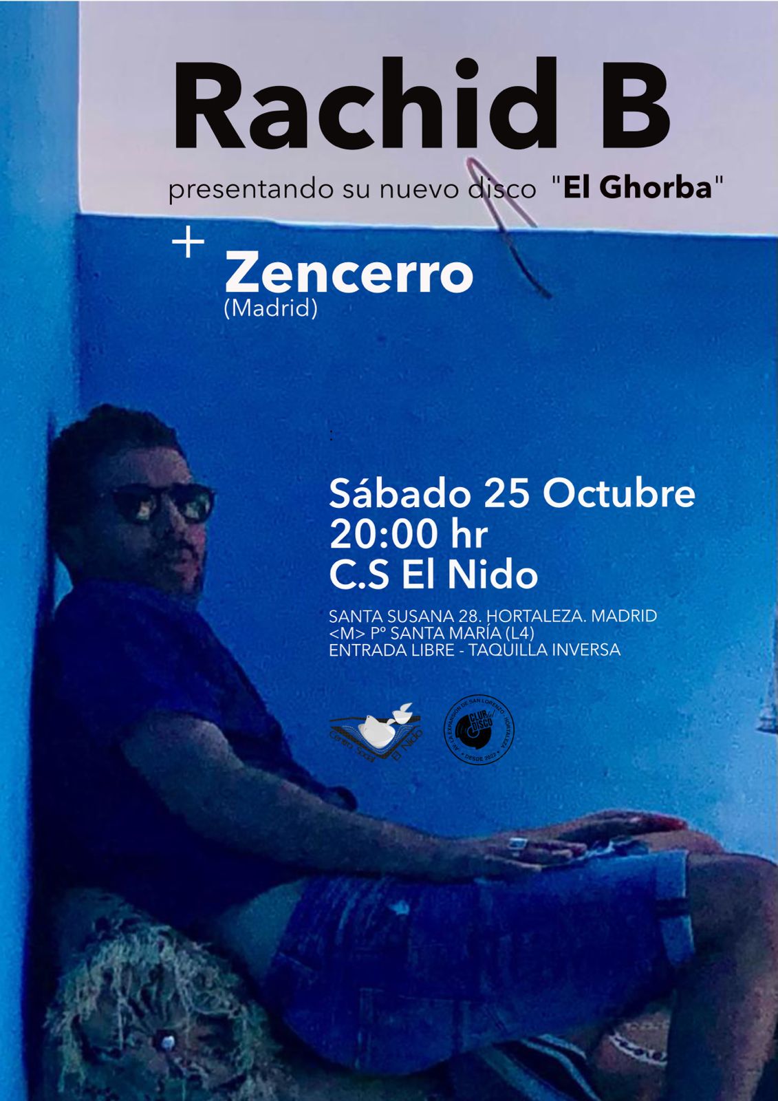 El sábado 25 de octubre a las 20.00 horas, continúa la nueva temporada de conciertos del Club del Disco de Hortaleza en el centro social El Nido (calle Santa Susana, 28 bajo) con la actuación en directo de Rachid B y Zencerro.