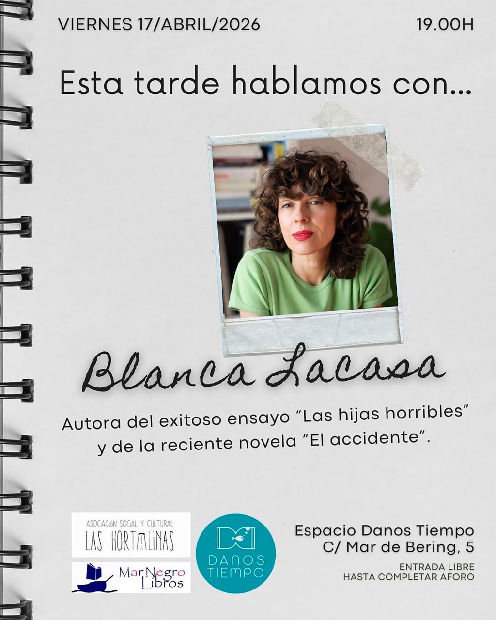 El viernes 17 de abril a las 19.00 horas, el club de lectura Las Hortalinas invita al vecindario a participar en un encuentro con la periodista y escritora Blanca Lacasa, autora del ensayo Las hijas horribles (Libros del KO, 2023) y de la novela El accidente (Libros del Asteroide, 2025) en el Espacio Danos Tiempo (calle Mar de Bering, 5).
