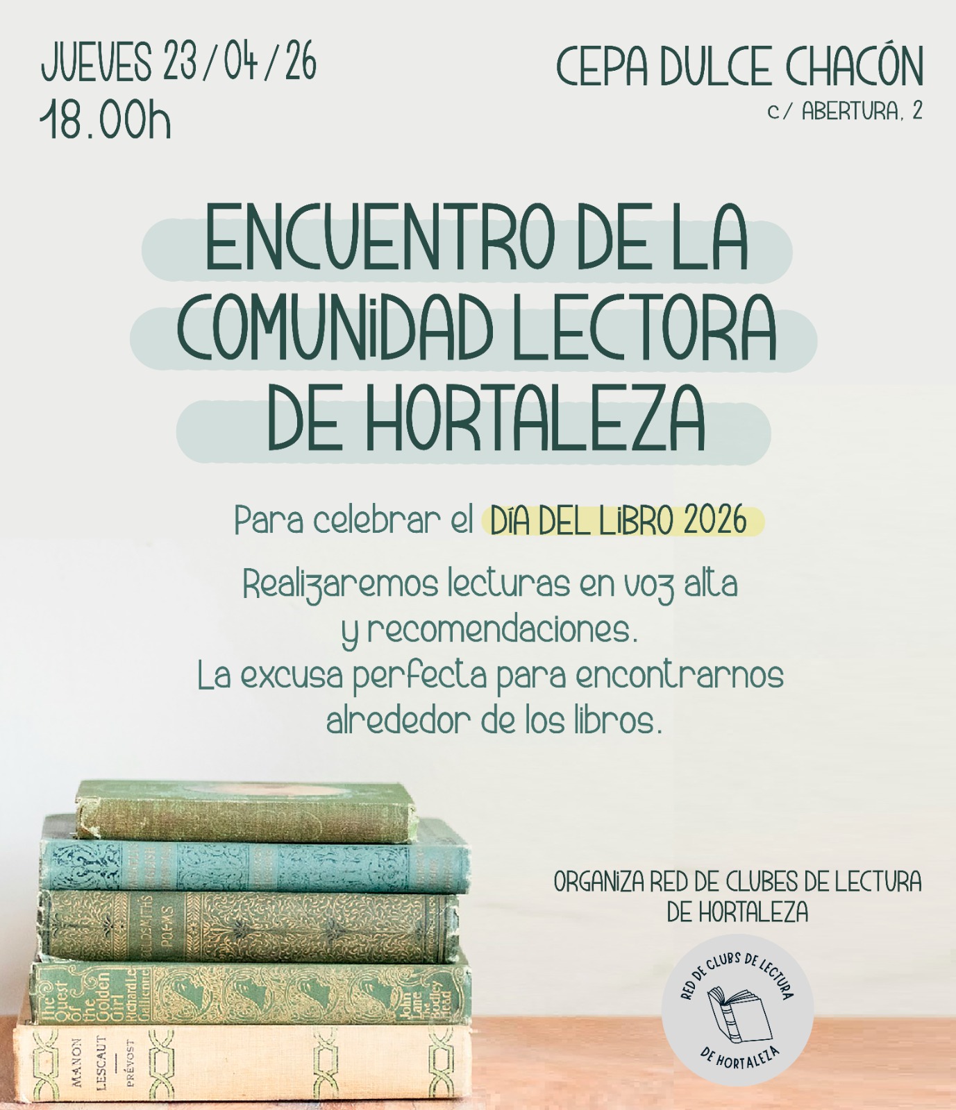 El jueves 23 de abril a las 18.00 horas, la Red de Clubes de Lectura de Hortaleza invita al vecindario a celebrar el Día del Libro con un nuevo encuentro de la comunidad lectora de Hortaleza en el centro de educación de personas adultas Dulce Chacón (calle Abertura, 2) en el barrio de la UVA, donde se realizarán lecturas en voz alta y recomendaciones.