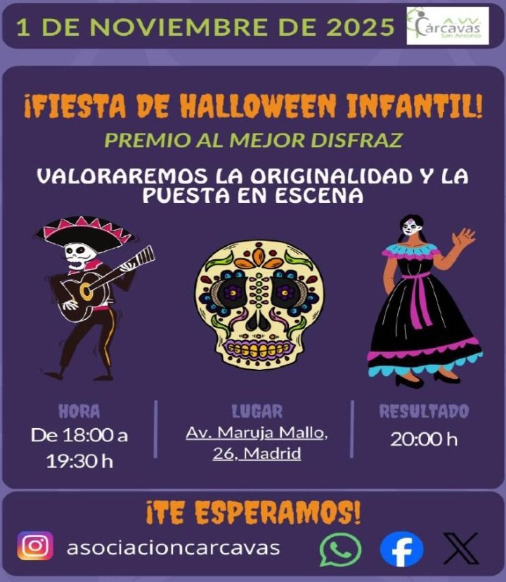 El sábado 1 de noviembre a las 18.00 horas, pasa una tarde terrorífica en la Fiesta infantil de Halloween que se celebra en la sede de la asociación vecinal Las Cárcavas-San Antonio en la plaza de la Unión (calle Maruja Torres, 26).