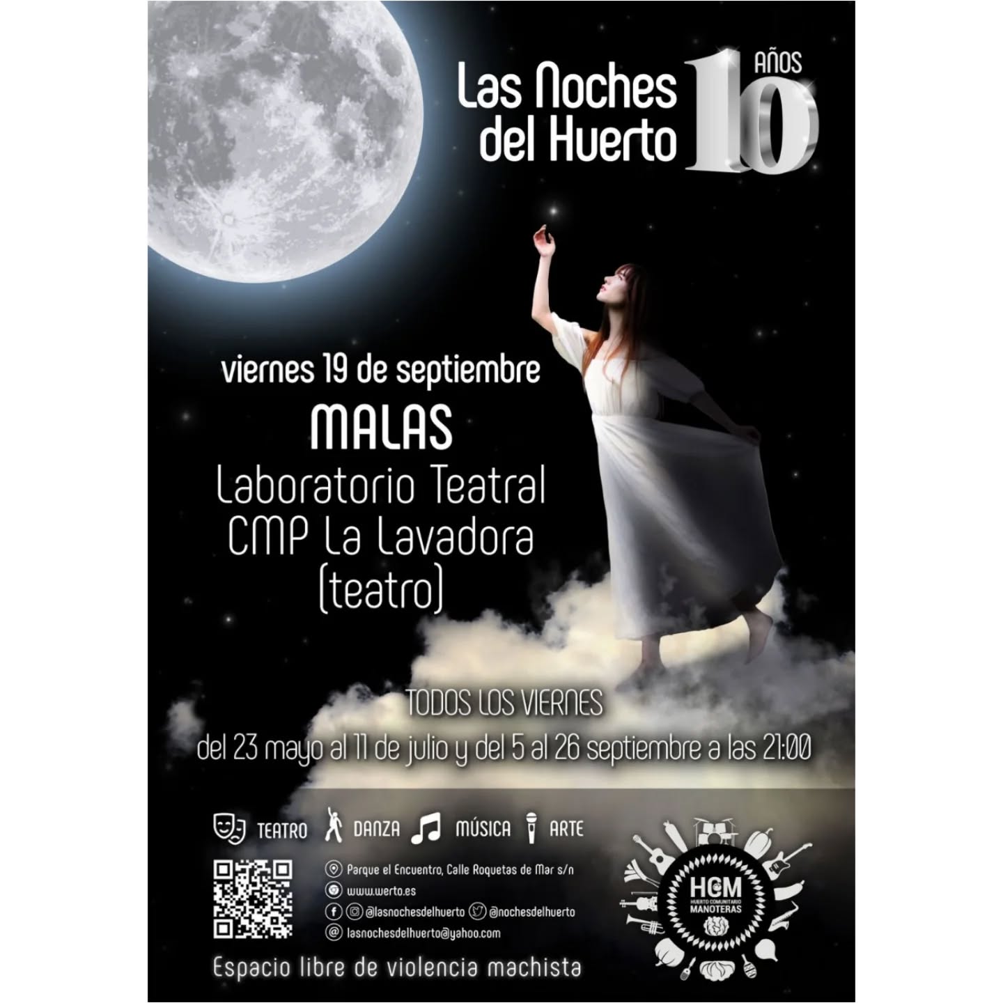 El viernes 19 de septiembre a partir de las 21.00 horas, continúa la décima temporada del ciclo de actuaciones al aire libre Las Noches del Huerto de Manoteras con la representación de Malas de la plataforma artística de mujeres Cómo me Pone la Lavadora en el escenario del teatro del Huerto Comunitario de Manoteras (calles Cuevas de Almanzora con Roquetas de Mar).