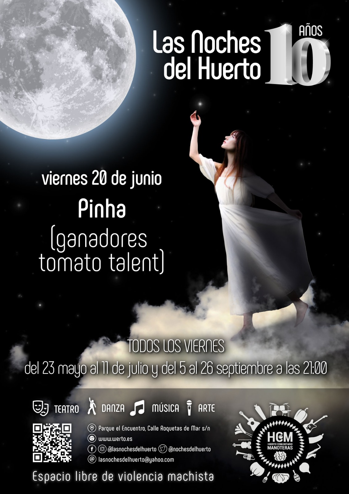 El viernes 20 de junio a partir de las 21.00 horas, continúa la décima temporada del ciclo de actuaciones al aire libre Las Noches del Huerto de Manoteras con el concierto de Pinha en el escenario del teatro del Huerto Comunitario de Manoteras (calles Cuevas de Almanzora con Roquetas de Mar).