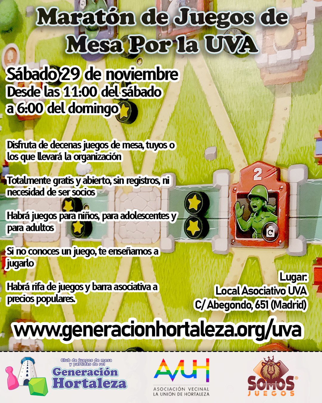 El sábado 29 de septiembre desde las 12.00 horas hasta las 6.00 horas del domingo, se celebra una maratón de juegos de mesa por la UVA en el Espacio Asociativo UVA (calle Abegondo, 651) organizada por Generación Hortaleza, en colaboración con Somos Juegos