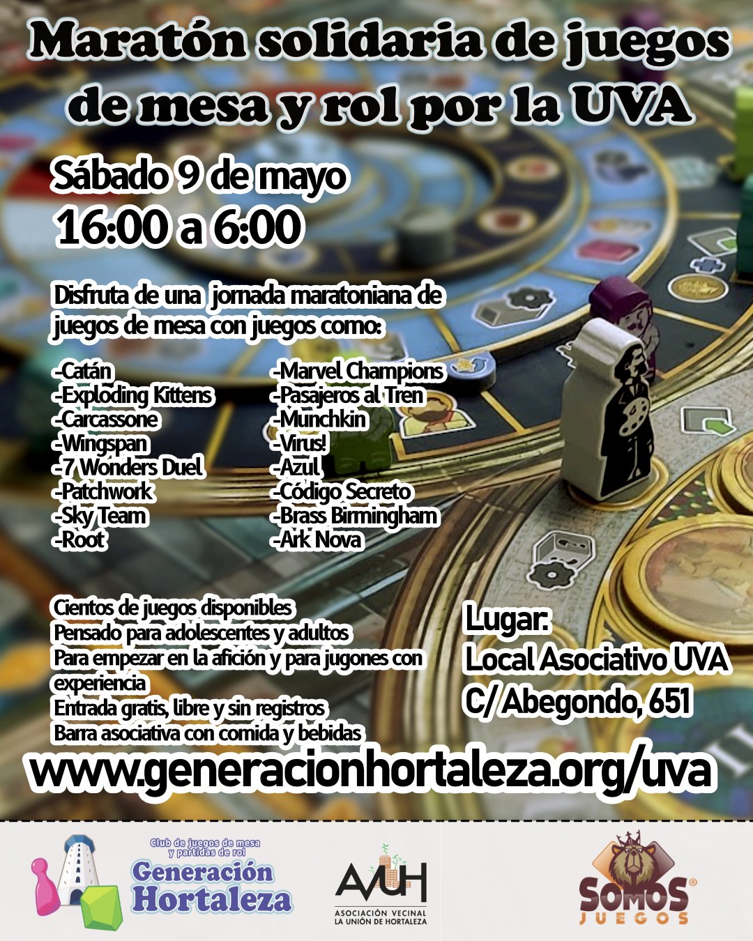 El sábado 9 de mayo desde las 16.00 horas hasta las 6.00 horas del domingo, se celebra una maratón solidaria de juegos de mesa y rol por la UVA de Hortaleza en el Espacio Asociativo UVA (calle Abegondo, 651) organizada por Generación Hortaleza, en colaboración con Somos Juegos.