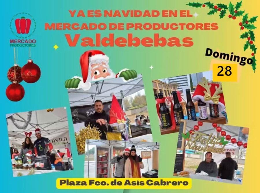El domingo 28 de diciembre desde las 10.00 hasta las 16.00 horas, se celebra el Mercado de Productores de Valdebebas diciembre 2025, que se ubica los cuartos domingos de cada mes en la plaza de Francisco de Asís Cabrero, junto a la Avda. de Juan Antonio Samaranch.