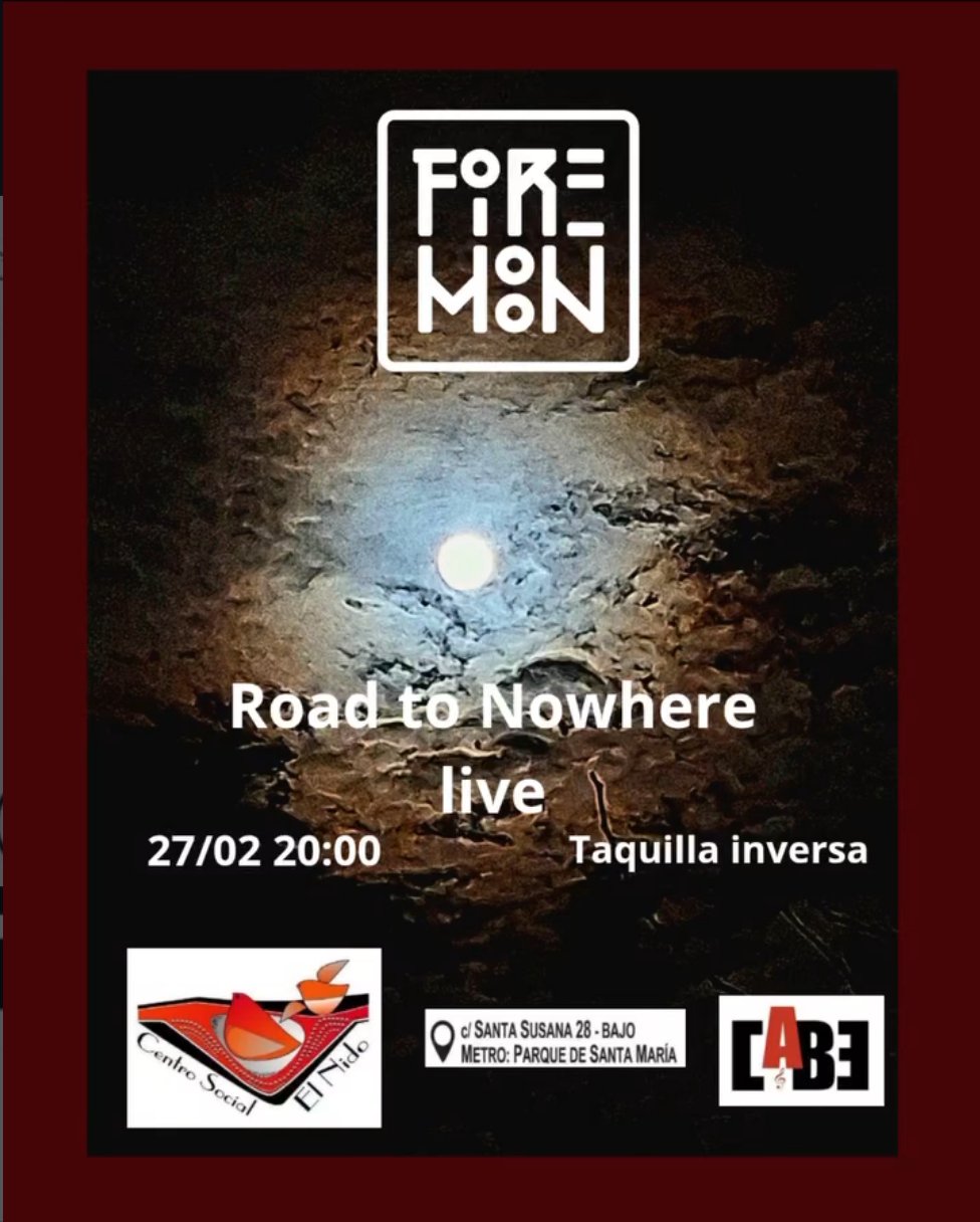 El viernes 27 de febrero a las 20.00 horas, la banda hortalina de rock progresivo Firemoon presenta en concierto su segundo álbum, Road to Nowhere, en el centro social El Nido (calle Santa Susana, número 28 bajo).