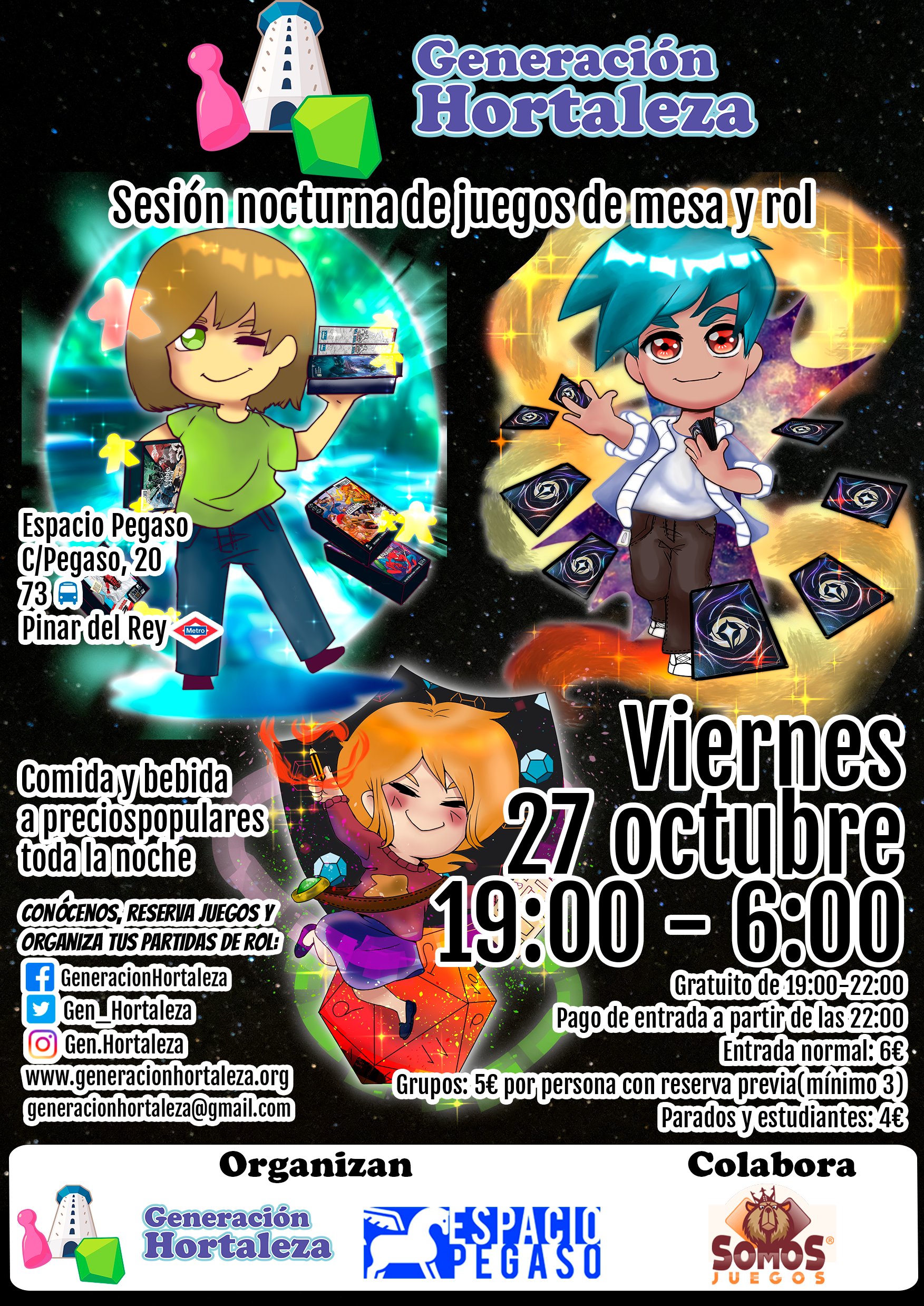El viernes 27 de octubre desde las 19.00 horas hasta las 6.00 horas del sábado, disfruta de una nueva sesión nocturna de juegos de mesa y rol en el Espacio Pegaso (calle Pegaso, 20) organizada por Generación Hortaleza, en colaboración con Somos Juegos.