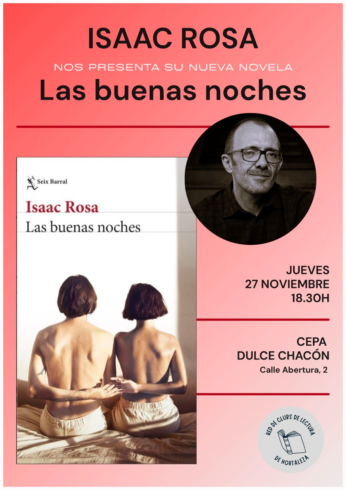 El jueves 27 de noviembre a las 18.30 horas, la Red de Clubes de Lectura de Hortaleza organiza una nueva sesión conjunto en el Centro de Educación de Personas Adultas Dulce Chacón (calle Abertura, 2) para hablar sobre Las buenas noches, la nueva obra que Isaac Rosa, con cuya presencia se contará en el acto.
