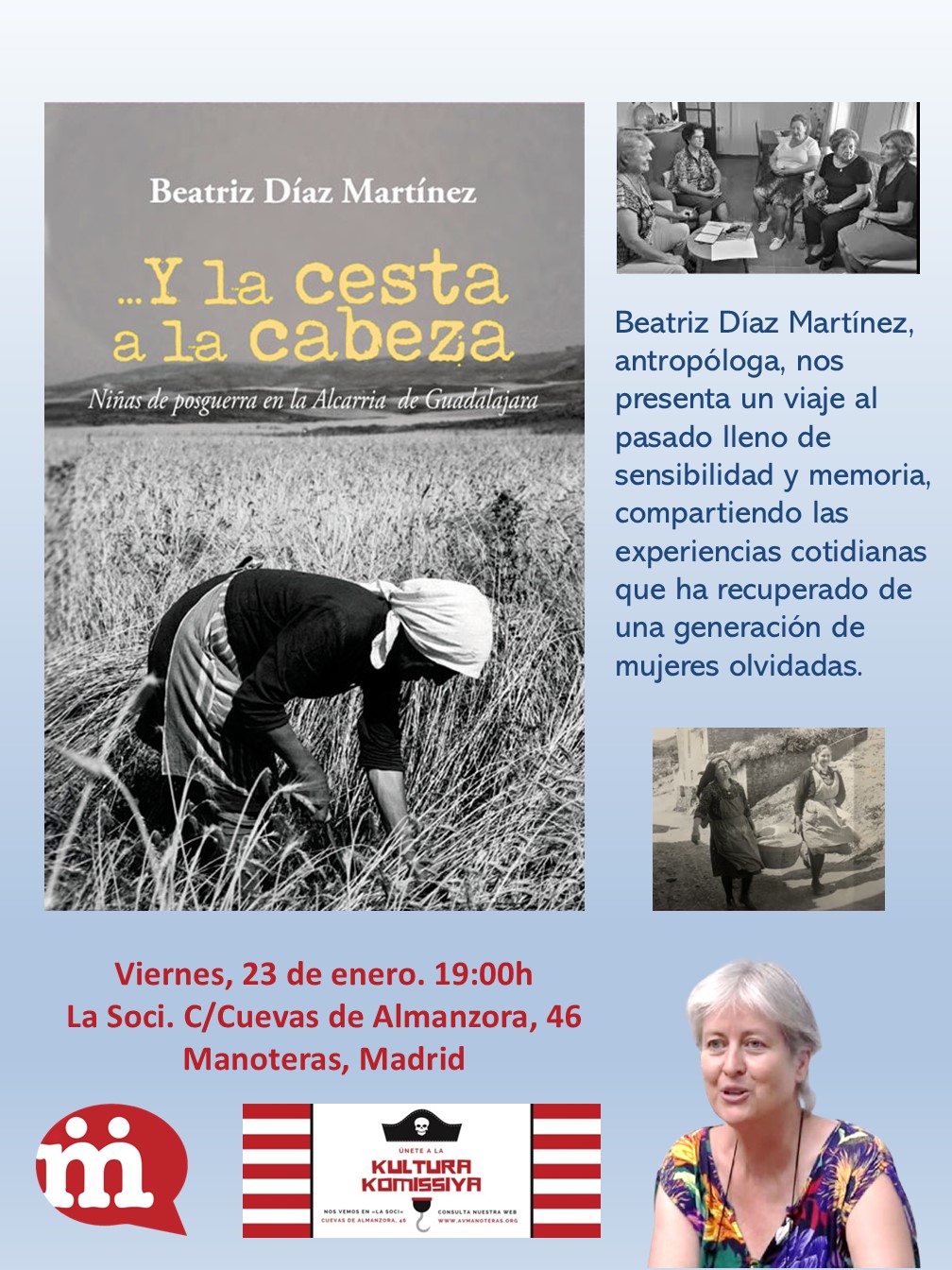El viernes 23 de enero a las 19.00 horas, la asociación Kultura Komissiya organiza la presentación de la novela Y la cesta en la cabeza (2025) en la Soci de Manoteras(calle Cuevas de Almanzora, 46), a la que seguirá una tertulia posterior.
