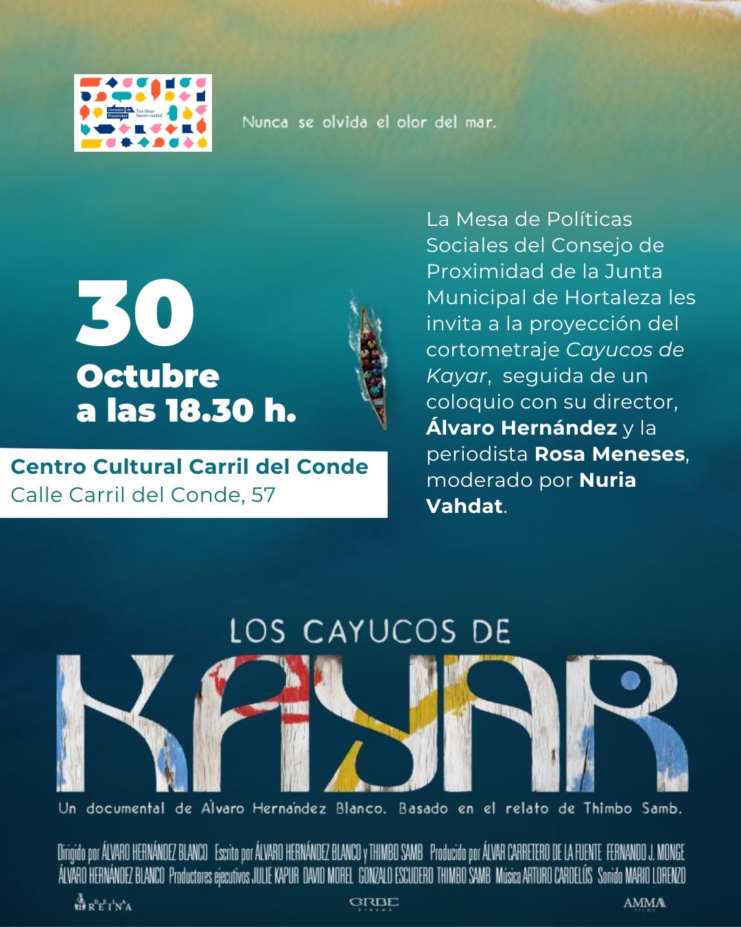 Desde la Mesa de Políticas Sociales del Consejo de Proximidad de Hortaleza, invitan al vecindario a asistir el jueves 30 de octubre a las 18.30 horas a la proyección y posterior coloquio de Los cayucos de Kayar en el centro cultural Carril del Conde (calle Carril del Conde, 57).