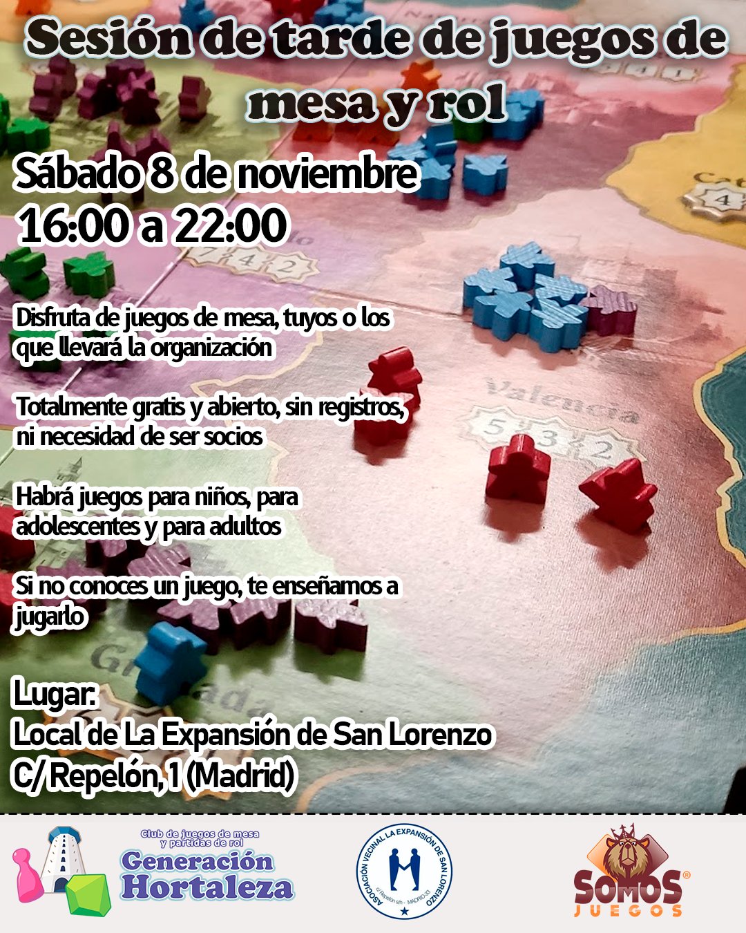 El sábado 8 de noviembre desde las 16.00 horas hasta las 22.00 horas, se celebra una nueva sesión de tarde de juegos de mesa y rol en San Lorenzo en la sede de la asociación vecinal La Expansión de San Lorenzo (calle Repelón, 6) organizada por Generación Hortaleza, en colaboración con Somos Juegos.