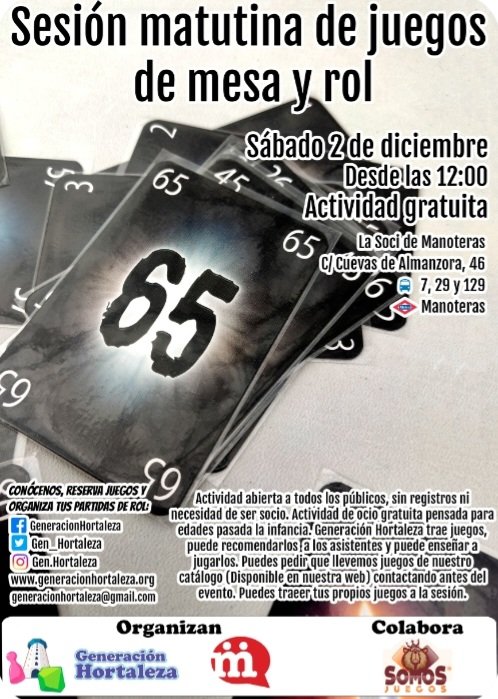 El sábado 2 de diciembre desde las 12.00 horas, se celebra una nueva sesión matinal de juegos de mesa en La Soci de Manoteras (Cuevas de Almanzora, 46) organizada por Generación Hortaleza, en colaboración con Somos Juegos.