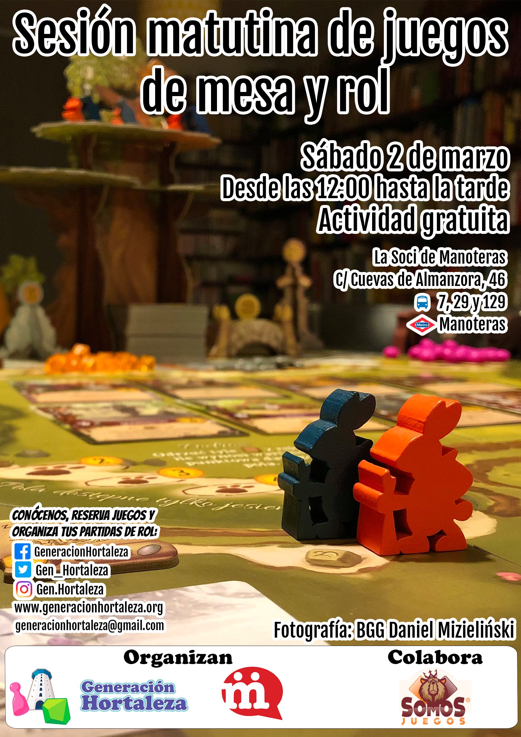 El sábado 2 de marzo desde las 12.00 horas, se celebra una nueva sesión matutina de juegos de mesa en la Soci de Manoteras (Cuevas de Almanzora, 46) organizada por Generación Hortaleza, en colaboración con Somos Juegos.