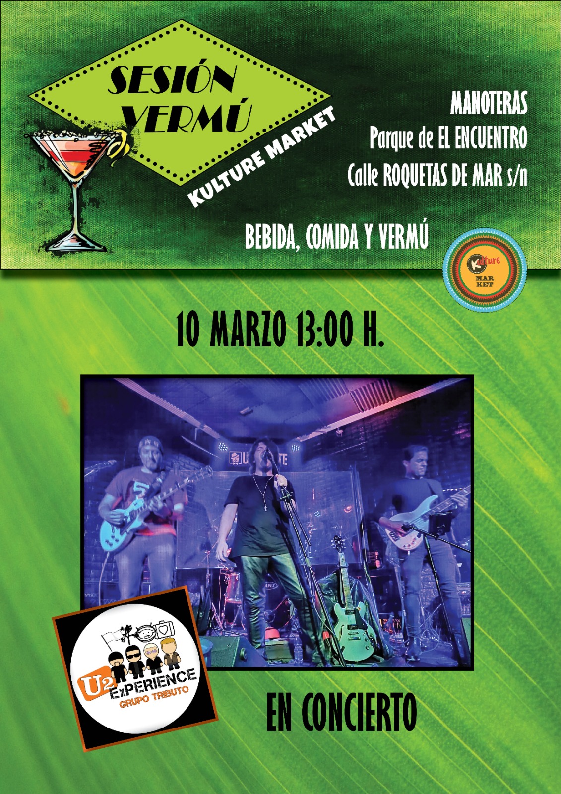 El domingo 10 de marzo a las 13.00 horas, la asociación Kulture Market celebra una nueva sesión vermú con el concierto de U2 Experience, grupo tributo a U2, en el parque de El Encuentro (calle Roquetas de Mar, s/n) en el barrio de Manoteras.