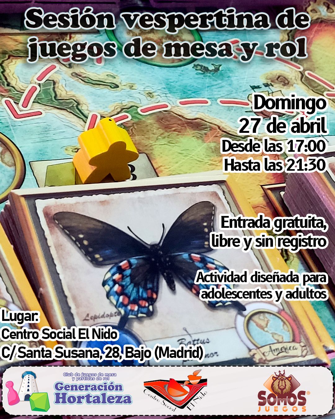 El domingo 27 de abril desde las 17.00 horas, gracias a Generación Hortaleza, en colaboración con Somos Juegos, se organiza una nueva sesión vespertina de juegos de mesa y rol en el centro social El Nido (Santa Susana, 28 bajo).