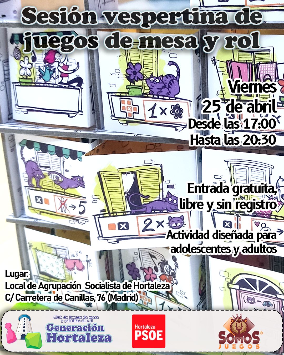 El viernes 25 de abril desde las 17.00 horas, gracias a Generación Hortaleza, en colaboración con Somos Juegos, se organiza una nueva sesión vespertina de juegos de mesa y rol en PSOE Hortaleza, es decir, en el local de la Agrupación Socialista de Hortaleza (Carretera de Canillas, 76).