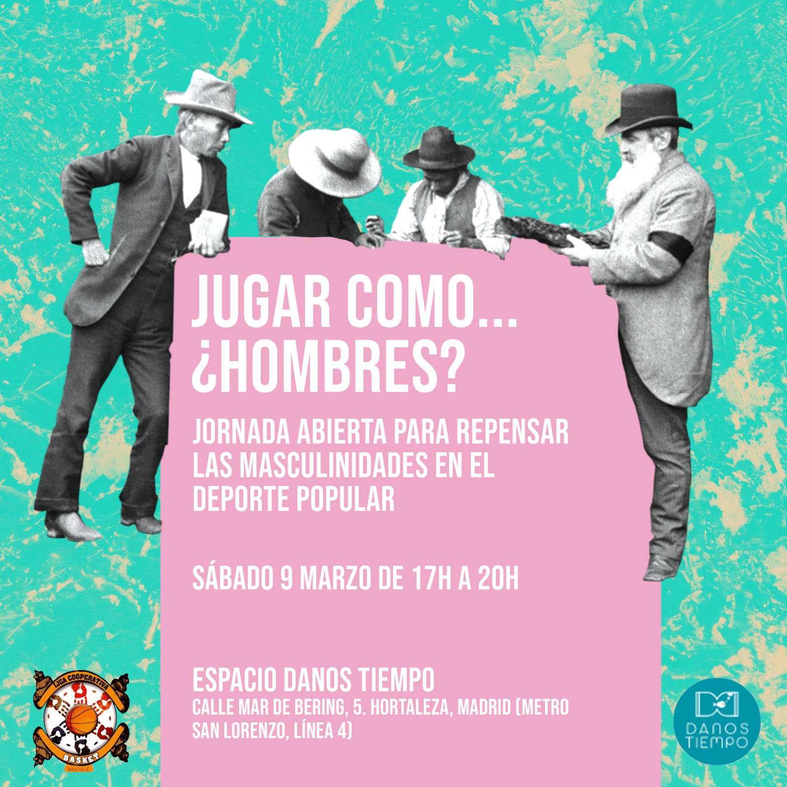 La comisión feminista de la Liga Cooperativa de Baloncesto organiza el sábado 9 de marzo, de 17.00 a 20.00 horas, el taller Jugar como… ¿hombres? en el Espacio Danos Tiempo (Mar de Bering, 5) para repensar las masculinidades en el deporte.