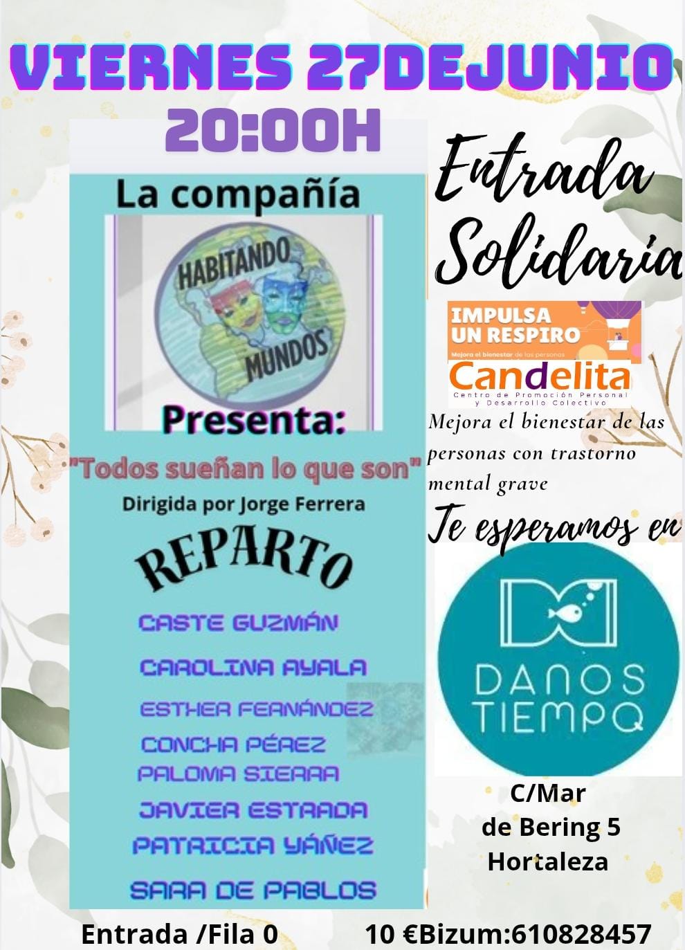 Entrada libre hasta completar aforo con aportación solidaria voluntaria. También puedes colaborar a través de Fila 0 con un Bizum de 10 euros al 610 82 84 57.
