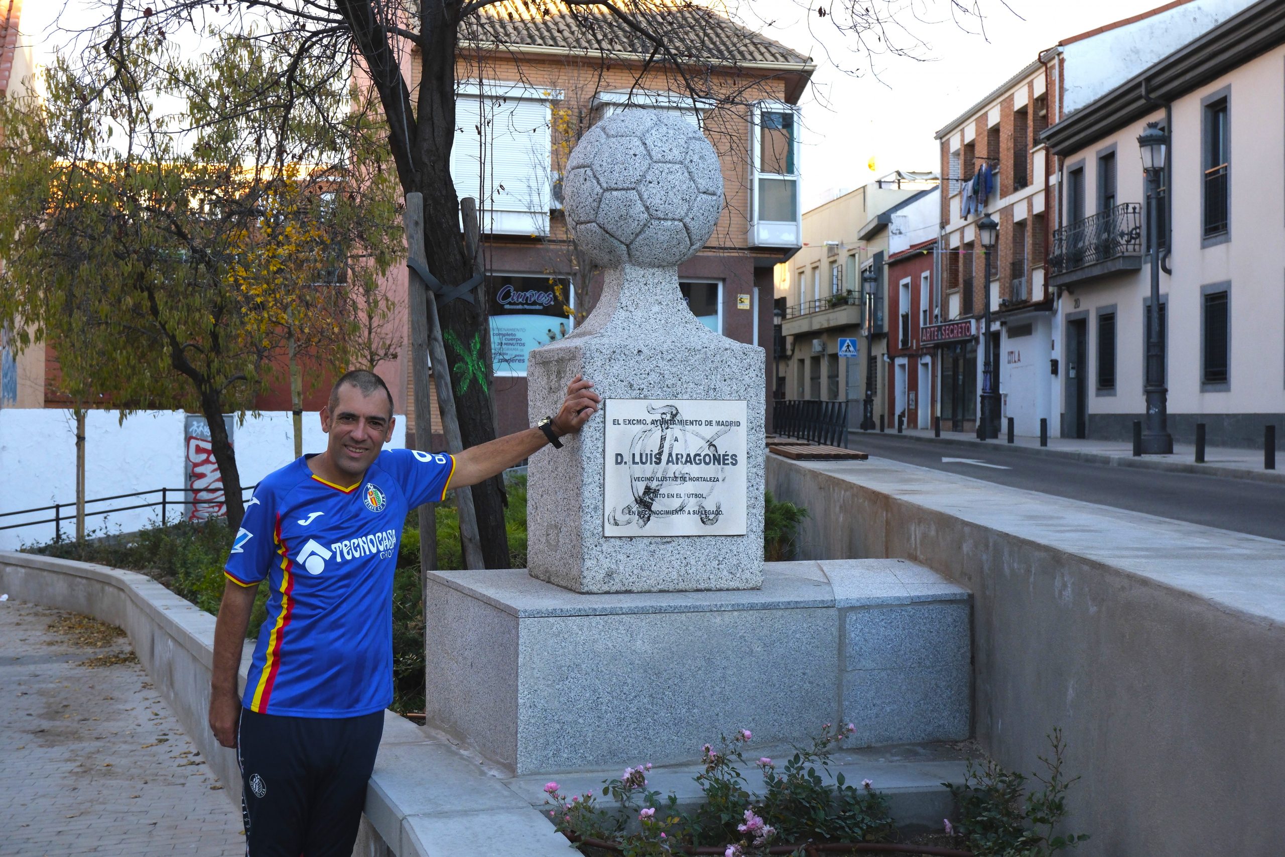 Juan Antonio Teno Mateos, junto al monumento levantado a Luis Aragonés en el cruce de las calles Mar de Bering y Mar Caspio. JULIA MANSO